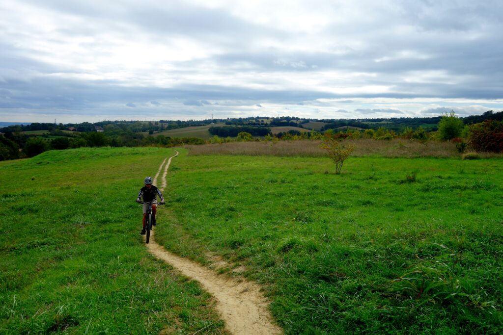 Balade avec Bastien au départ de la zone verte de Pech-David vers les coteaux du Lauragais sur le GR 6353, des sentiers balisés ou pas. J’ai sorti le VTT, il faut bien que je le sorte de temps en temps, c’est une pièce de collection mais j’ai toujours plaisir à