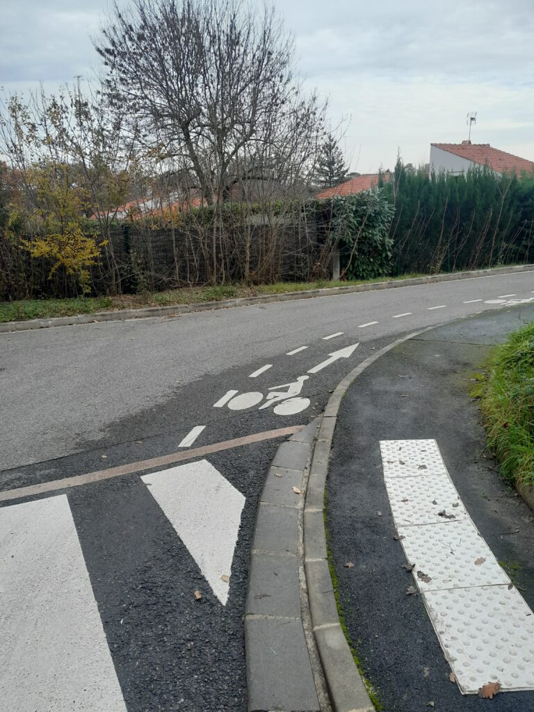 Je suis toujours très méfiant dans ce virage en contresens cyclable à Castelmaurou, il y a pourtant une ligne continue et un petit cycliste peint au sol pour inciter les automobilistes à bien rester à droite en tournant.